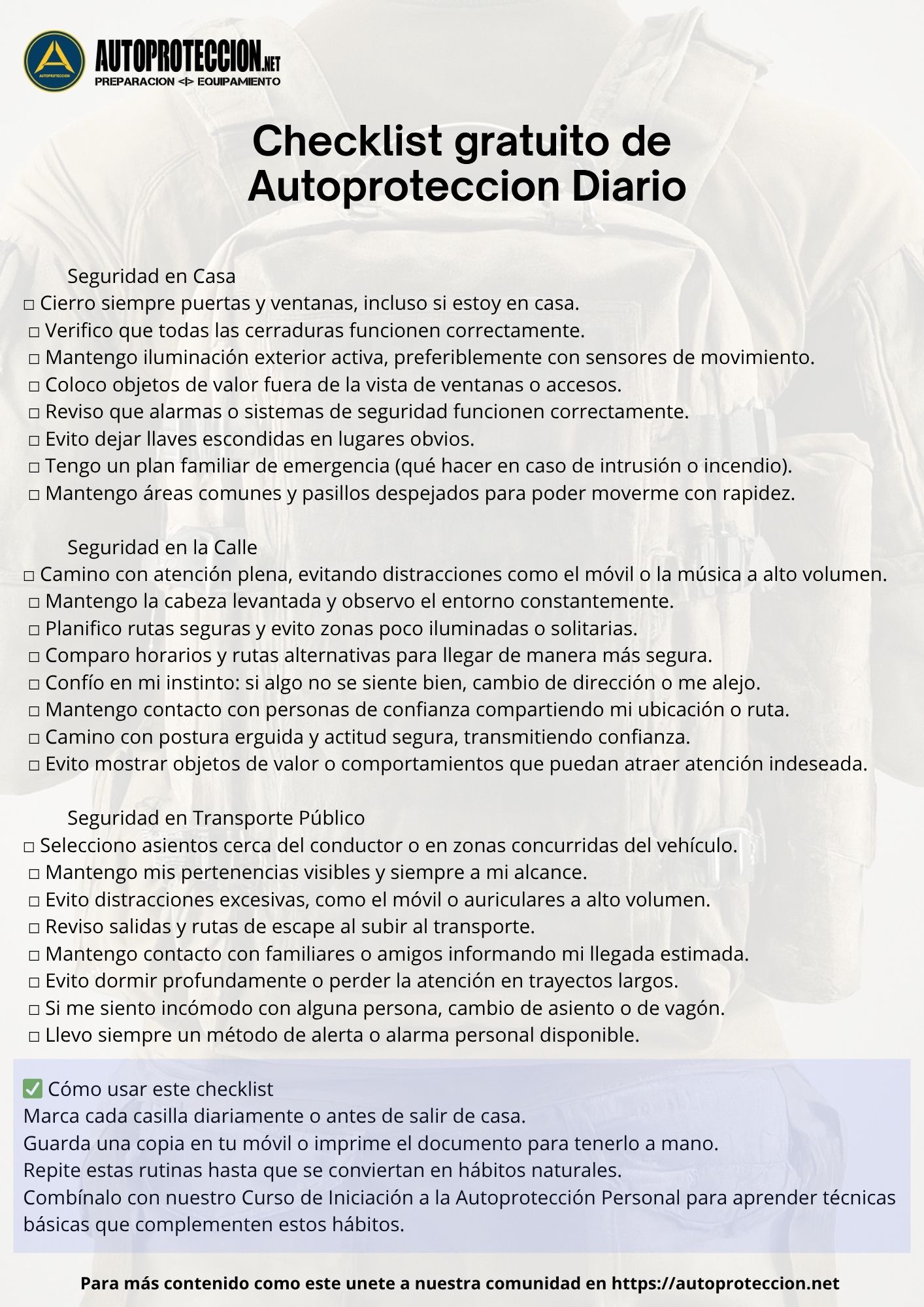 En este post te compartimos 10 consejos de autoprotección prácticos y fáciles de aplicar, acompañados de un checklist descargable gratuito con hábitos de seguridad en casa, calle y transporte público. Además, te presentamos nuestro Curso de Iniciación a la Autoprotección Personal, diseñado para principiantes que desean aprender técnicas sencillas y aplicables en la vida diaria.
